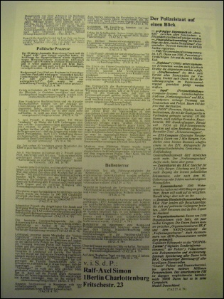 Der Polizeistaat auf einen Blick großzügiger Datentausch als „Amtshilfe“ zwischen allen Staatsschutz- u. Polizeideinststelle (soll weniger werden) „Fingerabdrucksammlung“ für Flüchtlinge au dem „realen Sozialismus“, Ostumsiedler , Dietrich Genscher ist dort als Sachse registriert. PIZ (Personenindentifizierungszentrale) z. Zt. Daten von 3500 „Terrorismus“- Verdächtigten. Ich und Du,, nebst Müllers Kuh „Haftdatei“ (13000): neben sogenannten Kriminellen werden auch psychisch Kranke die eingewiesen wurden, erfaßt. „Strafdatendatei“ des BKA: stellt Herold allen Dienststellen zur Verfügung. Enthält auch Daten, die als Bewährungsstrafen im Bundeszentralregister gesetzlich getilgt werden müßten. „Inpol“ (Personenfahndungs-Computer-Systeme) Gemeinschaftsbetrieb von „Verfassungsschutz“ und BKA. Grundgesetz verlangt Trennung von Staatsschutz und Polizei. Baum will da jetzt mal durchsetzen. „Pios“ (Personen, Objekte, Sachen, Institutionen, die mit der Stadtguerilla in Verbindung gebracht werden):135000 Namen, auch zufällige Kontakte, Knastbesuche, 800 Atomkraftgegner. Herold will PIOS als BKA-Schriftenreihe drucken und allen Behörden offerieren. Bestzeller-Titel:“Erkenntnismappen“. „ZPI-Computer“ (Daten von 2 Mio Bürgern. Verdächte eines kleinen Beamten schachfen einem in den ZPI. Abfragerecht für Landespolizeibehörden, Grenzschutz, Zollfahndung. Generalbundesanwalt darf inzwischen nicht mehr. Der „Verfassungsschutz“ durfte nicht, hätte aber gerne. Zentralkartei des BKA: Speicher für 2,3 Mio Bürger. Löschung erst 25 Jahre nach Zugang der letzten polizeilichen Erkenntnisse, oder nach dem 90.Geburtstag oder 3 Jahre nach der eigenen Himmelfahrt. Komunedatei:1000 Wohngemeinschaften mit 4000 Bürgern gespeichert. Baum will wohl auf sie verzichten. Herold hängt aber sehr an ihr. Zentrale Handschriftensammlung des Bka: Hier landen alle Besuchsanträge, die sich auf politische Gefangene beziehen. 2000 Personen sind da drin. Export ins Ausland. Organisationsdatei: Daten von 3100 Organisationen viele linke, ein paar rechte Gruppen. Die Daten floaten munter zwischen „Organisationsdatei BKA“ und dem NADIS-Computer des „Verfassungsschutzes“. Auch Autonummern von AKW-Demonstranten werden dort gehandelt. Geplanter Höhepunkt ist das „DISPOL-System“ („digitales Sonderinformationsnetz der Polizei“). Vollautomatische Dokumentation und Archivierung Zentrale Speicherung aller Daten beim BKA.Gegenseitiger Direktzugriff aller beteiligten Dienststellen. „Unsere“ Polizei- und Staatsschutzstellen speichern mehrer Millionen Personaldaten. Das amerikanische FBI ist dagegen vergleichsweise harmlos:müde 30000 hat es in seinen Computern, Modell Deutschland. - Taz 27.4. 79 (aus Knastblatt Nr.9)