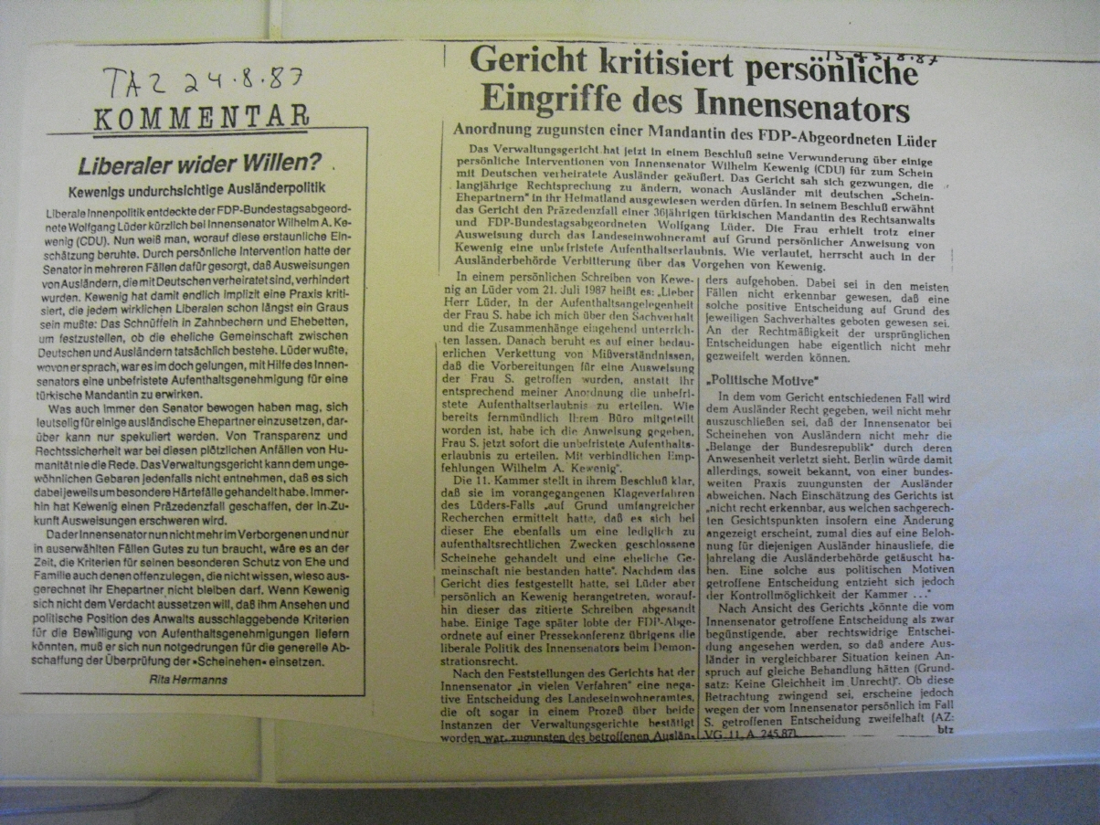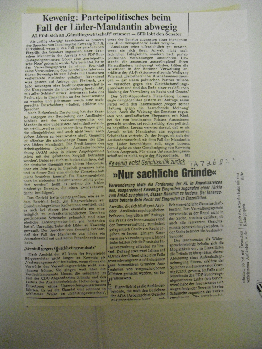 Die Vorgeschichte Ein Schachfreund kannte meine Einstellung zur Ehe und sprach mich deshalb an:"Ayse ist verzweifelt, die möchte gerne in Deutschland bleiben!" Deshalb heirateten wir 1980. Für mich ist ,da leben zu können.wo man/frau es sich selber aussucht, ein Menschenrecht und es war mir eine diebische Freude diesem Staat ein Schnippchen schlagen zu können, ausgerechnet mit der kleinsten Unterdrückungsform - der Ehe- die, für menschliche Ziele zu gebrauchen, schien mir der Geschichte dieses Verbrecherstaates die Krone der Ironie aufsetzen zu können. dass mir meine Frau obendrein nicht gerade unsymphatisch aber doch zumindest sehr fremd erschien -sie wollte sich in diese Gesellschaft integrieren, ich kämpfte mit allen Mitteln gegen diese Gesellschaft- beruhigte mich -denn mich in meine eigene Frau zu verlieben, hätte ich als einen Supergau empfunden- aber brachte mir auch das Unverständnis meiner Freunde ein:"Wenn dir schon nichts mehr heilig ist, dann heirate doch wenigstens eine Genossin!" hier zu bleiben ist ein Menschenrecht und damit basta! Wir waren relativ gut vorbeireitet:wir hatten uns den entwürdigenden 36 seitigen Fragenkatalog der Ausläderbehörde besorgt und die möglichen Fragen im detail abgestimmt. Anfänglich fiel unsere Ehe wohl auch nicht auf. Als die Ausländerbehörde genug Beweismaterial für eine "Scheinehe" zusammengetragen hatte, bestand für uns gewissermaßen ein gewisser Schutz:ich war im Knast, also waren wir nicht gezwungen zusammen zu leben. Während meiner Haftzeit besorgte sich meine Frau Wolfgang Lüders, den ehemaligen Wirtschaftssenator von der FDP, als Anwalt, weil sie bei ihm schon einmal geputzt hatte. Und er kümmerte sich wirklich rührend um meine Frau:ging mit ihr sogar mit zur Ausländerbehörde und machte die ganze tageweise entwürdigende Warterei mit, bis sie endlich diesen lebensverlängernden Stempel in ihren Pass bekam, wenn auch nur auf Zeit. Dann 1986 schien das Kind endgültig in den Brunnen gefallen. die Ausländerbehörde hatte schon den Ausweis meiner Frau eingezogen, mit dem Ziel sie möglichst schnell abzuschieben. Da gelang Wolfgang Lüders ein genauso üngewöhnlicher wie genialer Deal: er sprach sich auf einer Pressekonferenz des damaligen CDU-Innensenators für seine Politik aus und erhielt dafür im Gegenzug die Aufenthaltserlaubnis für meine Frau! Dieses Recht hat ein Innensenator. Die politische Opposition war erbost, tagelang berichtete die Presse von diesem Willkürakt. Renate Künast machte damals ihr Referendariat bei Wolfang Wieland, dem Lokalpolitiker der Grünen, der später auch mal Senator für Justiz wurde. Auch hier ein Aufschrei des Entsetzens über diese Senatorwilkür - als sie erst viel später mitbekamen, dass es mein Fall war, mussten sie doch schmunzeln. Aber auch die Verwaltung war über das Verhalten ihres obersten Dienstherren so stinkig, dass sie gegen uns ein Strafverfahren einleiteten, wegen Erschleichung der Aufenthaltserlaubnis. Die Gerichte mahlen langsam, so daß es erst anfang 1988 zum verfahren kam. ich weiß, daß andere Menschen bei ähnlicher Beweislage , ein halbes Jahr Knast bekommen haben, was sich bei mir sehr dramatisch hätte auswirken können, da ich ja noch Bewährung hatte:insgesamt mußte ich mit anderthalb Jahren Knast rechnen. Nun hatte gerade rot-grün die Wahl gewonnen, was in den Augen der Gerichte einem Erdbeben gleichkam und sie einen Erdrutsch befürchteten. lange Rede, kurzer Sinn: nachdem unser Anwalt bekundete, dass er noch nie ein Paar gesehen hätte, was sich so wenig streiten würde, er könne das , als gerade Geschiedener, besonders gut beurteilen, sprach man uns tatsächlich frei mit der Begründung als Ehepaar müsse man nicht zusammen wohnen, als Beweis wurde die gutgehende Ehe einer CDU -Größe angeführt ( kleine Gemeinheit meines Unterbewußtseins:ich habe mir den Namen nicht merken können, weil ich den Akt mich mit einer CDU-Größe zu vergleichen als eine Beleidigung empfunden habe).