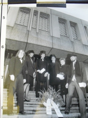 Ach ja, der Anlaß, weshalb wir so jung zusammengekommen sind:das Knastghetto in Plötzensee war fertig geworden. Wir hatten alle die letzten Jahre dagegen gearbeitet, daß da über dreihundert neue Haftplätze gebaut wurden und die auf Hochsicherheitsniveau, Sägezahnfassade (damit man/frau nicht am Fenster reden kann), jeder hat einen eigenen sanitären Anschluss, damit auch darüber keine Kommunikation möglich ist...Die Verantwortlichen waren nun mit dem Bau fertig und machten aus der Einweihung eine große Party, wozu auch die AL eingeladen wurde. Wir hatten vor in Trauerkleidung auf dem Fest mit unseren Einladungskarten einen Kranz niederzulegen. Natürlich kamen wir nicht rein (Dieter behauptete, das läge an meinen O-Beinen!) so, daß wir die Flugblätter draußen an alle hereinstürmenden Gäste verteilten. Kleine Geschichte am Rande: noch Jahre später hat sich Renate Künast darüber beömmelt, daß ich in der Diskussion mit einem hohen Mitarbeiter beim Senator für Justiz , der mich aufgrund meiner Verkleidung nicht wiedererkannt hatte, der mich vorwurfsvoll fragte, ich sei doch nicht etwa Mitglied bei der gehassten Al, antwortete:"natürlich bin ich Mitglied der AL!"