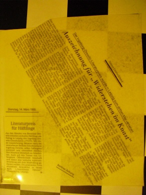 ... Zwei Berlinern wurde der Ingeborg-Drewitz-Preis wiederholt zuteil. Einer ist Ralf-Axel Simon. In seinen Knast-Tagebuchaufzeichnungen gibt er zu verstehen, was er unter Widerstehen im Knast, so das Thema der Ausschreibung, versteht:"Bei der Eingangsuntersuchung wolte ich mich nicht der Strahlenbelastung einer Lungeröntgung unterziehen, sondern bestand auf dem von der Weltgesundheitsorganisation empfohlenen Tuberkulintest... Ich muß dieser Anstaltsordnung etwas entgegensetzen!"Seine Harnäckigkeit bezahlte der Autor und Schachprofi während der ersten Wochen seiner Inhaftiereung mit einer "Von-Hand-zu-Hand-Verfügung". Klatext:Durch seine Weigerung, sich röntgen zu lassen, bestünde id epotenzielle Gefahr, mit Tuberkulosen infiziert zu sein, und der Häftling müßte daher von den übrigen Gefangenen isoliert werden. Als sich der spätere Test als negativ herausstellte, durfte Simon wieder am gemeinschaftlichen Hofgang und am Anstaltsduschen teilnehmen. Bis dahin mußte er jede Menge Schikane über sich ergehen lassen. Auch der Anstaltspfarrer bekam zu spüren, was Simon unter Widerstehen begreift. Der forderte gerade auf das lie zu singen"Allein Gott in der Höh`sei Ehr und Dank für seine Gnade", als Simon der Kragen platzte und er zum Altar rief:"Ne Sensibilität wie`n Holzklotz, ich zähle mal alleine die Knastjahre auf unsrer Bank zusammen und da sollen wir noch singen ,und dank für seine Gnade`..." Am nächsten Tag machte der Geistliche dem Häftling seine Aufwartung. Von Simon nächtens in Alpträumen geplagt, lag ihm die "Ohnmacht von gestern im Magen". Sie häten fast zwei Stunden miteinander geredet, so Simon "die verschiedenen Seiten sind nich wegzudiskutieren, und doch ist es der Beginn einer Freundschaft".... Diemar Jochum