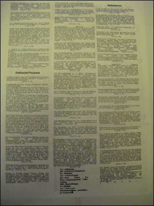 Ein Einzelfall? oder die übliche Praxis vorallem in politischen Prozessen!! Noch bevor der Angeklagte, die geladenen Zeugen und Sachverständigen gehört waren, hatte der Richter den Angeklagten schon zu einer Freiheitsstrafe von einem Jahr und vier Monaten verurteilt! In den Gerichtsakten lag schon der schriftlich formulierte Urteilsspruch!! TS 2.3. 79 (aus Knastblatt Nr.5)