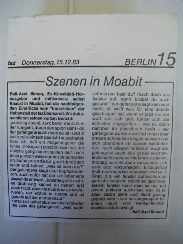 Szenen in Moabit Ralf-Axel Simon, Ex-Knastblatt-Herausgeber und mittlerweil selbst Knacki in Moabit, hat die nachfolgenden Eindrücke vom "Innenleben" der Haftanstalt der taz übersandt. Wir dokumentieren seinen kurzen Bericht. "samstag abend, kurz bevor der schließer rumgeht, durch den Spion sieht - ob der gefanene auch noch da ist - und in jeder zelle einzel das licht ausschaltet, höre ich, daß ein mitgefangener die fahne (notsignal) geschmissen hat. der übliche gang nimmt seinen lauf:nach einer ganzen weile kommt ein schließer an, bummert an die tür, guckt durch den spion und schreit:"was ist denn los?" der gefangene klagt über kopfschmerzen. ach dafür hat der schließer eine passende antwort:"tablette gibt`s nicht, ne dröhnung kannst du haben!arzt ooch nicht, denn da müßte ich ja telefonieren, der wohnt in rudow und ist gerade auf der mutter drauf!" kurze zeit später strürmen drei shließer die zelle des gefangenen:"was, kopfschmerzen hast du? mach doch das fenster auf, dann bleibst du auch gesund." der gefangene sagt kein wort mehr, er weiß was für eine stunde geschlagen hat. wenn er jetzt nur ein wort von sich gibt, fühlen sich die schließer angegriffen - wie es dann nachher im dienstbuch heißt - der gefangene würde zusätzlich noch über andere schmerzen klagen müssen und sich obendrein im bunker wiederfinden. nach diesem "erlebnis"wagt der gefangene auch das ganze wochenende nicht mehr auf die fahne zu gehen. montag wird er dann versuchen, sich zum arzt vorzumelden. hinzugefügt m uß noch werden:draussen sin es -4 grad, d.h. ein fenster aufmachen ist garnicht möglich. selbst bei gechlossenem fenster kann man es nur mit einem pullover aushalten, weil es in allen zellen zieht und nicht genug geheizt ewird - vier heiungsrippen für einen raum sind wahrscheinlich viel zu wenig Ralf-Axel Simon!
