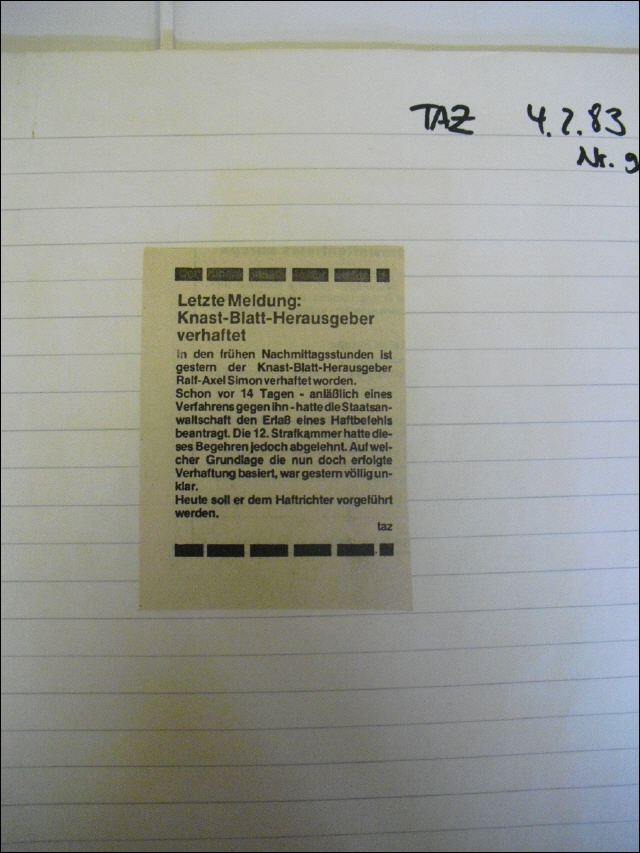 Letzte Meldung: Knast-Blatt-Herausgeber verhaftet In den Frühen Nachmittagsstunden ist gestern der Knst-Blatt-Herausgeber Ralf-Axel Simon verhaftet worden. Schon vor 14 Tagen - anläßlich eines Verfahrens gegen ihn- hatte die Staatsanwaltschaft den Erlaß eines Haftbefehls beantragt. Die 12. Strafkammer hatte dieses Begehren jedoch abgelehnt. Auf welcher Grundlage die nun doch erfolgte Verhaftung basiert, war gestern völlig ungeklar. Heute soll er dem Haftrichter vorgeführt werden.taz