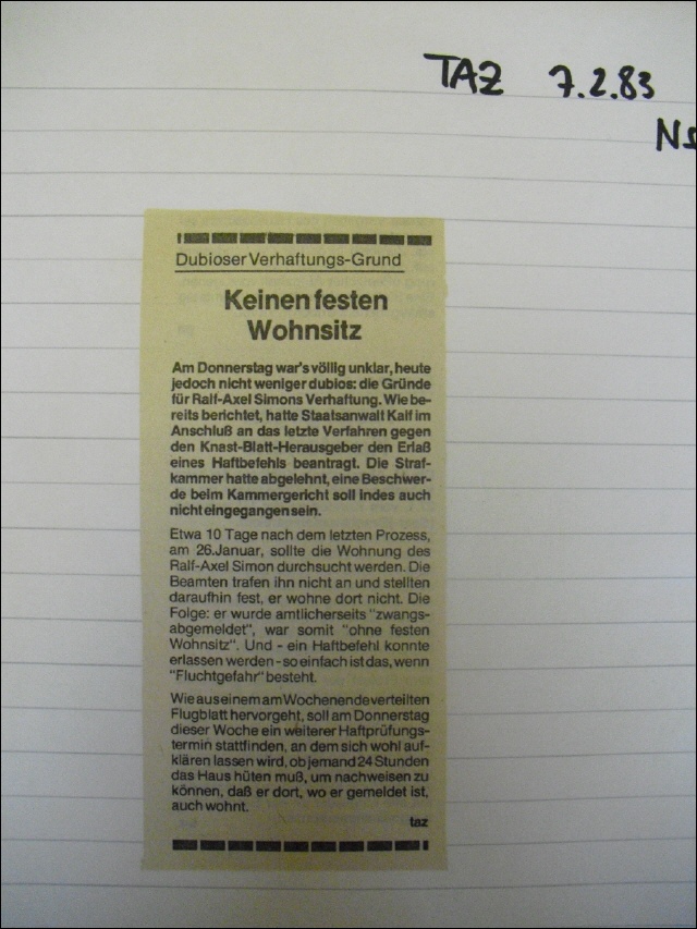 Etwa 10 Tage nach dem letzten Prozess am 26. Januar, sollte die Wohnung des Ralf-Axel Simon durchsucht werden. Die Bematen trafen ihn nicht an und stellten daraufhin fest, er wohne dort nicht. Die Folge:er wurde amtlicherseits "zwangsabgemeldet", war somit "ohne festen Wohnsitz". Und - ein Haftbefehl konnte erlassen weden - so einfach ist das, wenn "Fluchtgefahr" besteht. Wie aus einem am Wochenende verteilten Flugblatt hervorgeht, soll am Donnerstag dieser Woche ein weiterer Haftprüfungstermin stattfinden, an dem sich wohl aufklären lassen wird, ob jemand 24 Stunden das Haus hüten mu, um nachweisen zu können, daß er dort, wo er gemeldet ist, auch wohnt. taz