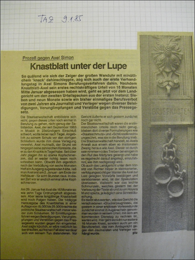 Die Staatsanwaltschaft enblödete sich nicht, gegen dieses Urteil noch einmal in Berufung zu gehen, nicht genug der Satisfaktion. Axel, der seit September 1983 in Moabit in 23stündigem Einschluß schmort, wolte lieber nach Tegel. Angeblich zu seinem Schutz vor den dortigen Schließern wurde ihm diese Verlegung verwehrt. Axel mutmaßt, der sei hingegen seine zahrreichen Kontakte, die er zu den Knackis in Tegel habe. Seit über Jahr plagen ihn so starke Kopfschmerzen, daß er weder richtig lesen noch schreiben kann. Obwohl ihm eigentlich nach der Verbüßung von sechs Monaten Haft ein Ausgang zugestanden hätte, lie man Axel erst am 2. Januar- am Ende der Haftdauer- für acht Stunden raus. In dieser Zeit war er endlich einmal ohne Kopfschmerzen. Am 29. Januar hat Axel die 16 Monate sowie zehn Tage Ordnungshaft begesessen. Aber seine lanjährige Knastarbeit wird noch Folgen haben. Die 14tägige Herausgabe des Knastblattes in einer Auflage von 15000 bis 25000 brachte die politische Staatsanwaltschaft immer wieder zu Schäumen. 50 Ermittlungsverfahren wegen Beleidigungen, Verunglimpfungen und Verstößen gegen das Pressegesetz wurden gegen ihn eingeleitet. Axel sagte kürzlich, er wäre natürlich lieber draußen, auf keinen Fall aber werde er sich von seinem Tun stistanzieren. Vor äußerte er sich zunächst noch gar nicht. Der Staatsanwaltschaft waren die erstinstanzlichen Urteile noch nicht genug, blieben dort diverse Formulierungen wie "Staatsschmutz" und "Schlüsselknecht" ungesühnt, was sie in die Berufung trieb. Die Staatsanwaltschaft handelt, so Axels Anwalt aus einem eben irrationalen Zwang heraus wie Axel. Dieser ist durch sein nimmermüdes Treiben bei einigen in den Ruf des Märtyrers gelangt und habe es regelrecht darauf angelegt, einzufahren, wie ihm nachgesagt wird. Ob auch das Landgericht unter dem Vorsitz von richter Hoyer in kleinkarierter, verfolgungssüchtiger Manier die Axel zur Last gelegten Vorwürfe bestätigen und sanktionieren wird, ist der Spekulation überlassen. Vielleicht war das leichte Schmunzeln, welches gestern bei der Verlesung der Texte ab ud zu um Hoyers Mund spielte, ja lediglich eine Sinnestäuschung. Es bleibt abzuwarten, wie das Gericht die verschiedenen "Druckerzeugnisse" die gestern in einer endlosen Vorlesestunde zunächst einmal in Augenschein genommen wurden in seinem Urteil, mit dem am kommenden Dienstag zu rechnen ist, werten wird. Hier geht es nicht nur weitere 16 Monate Knast, sondern auch um ein Berufsverbot , das vom Amtsgericht gegen den Journalisten ud Verleger verhängt wurde.