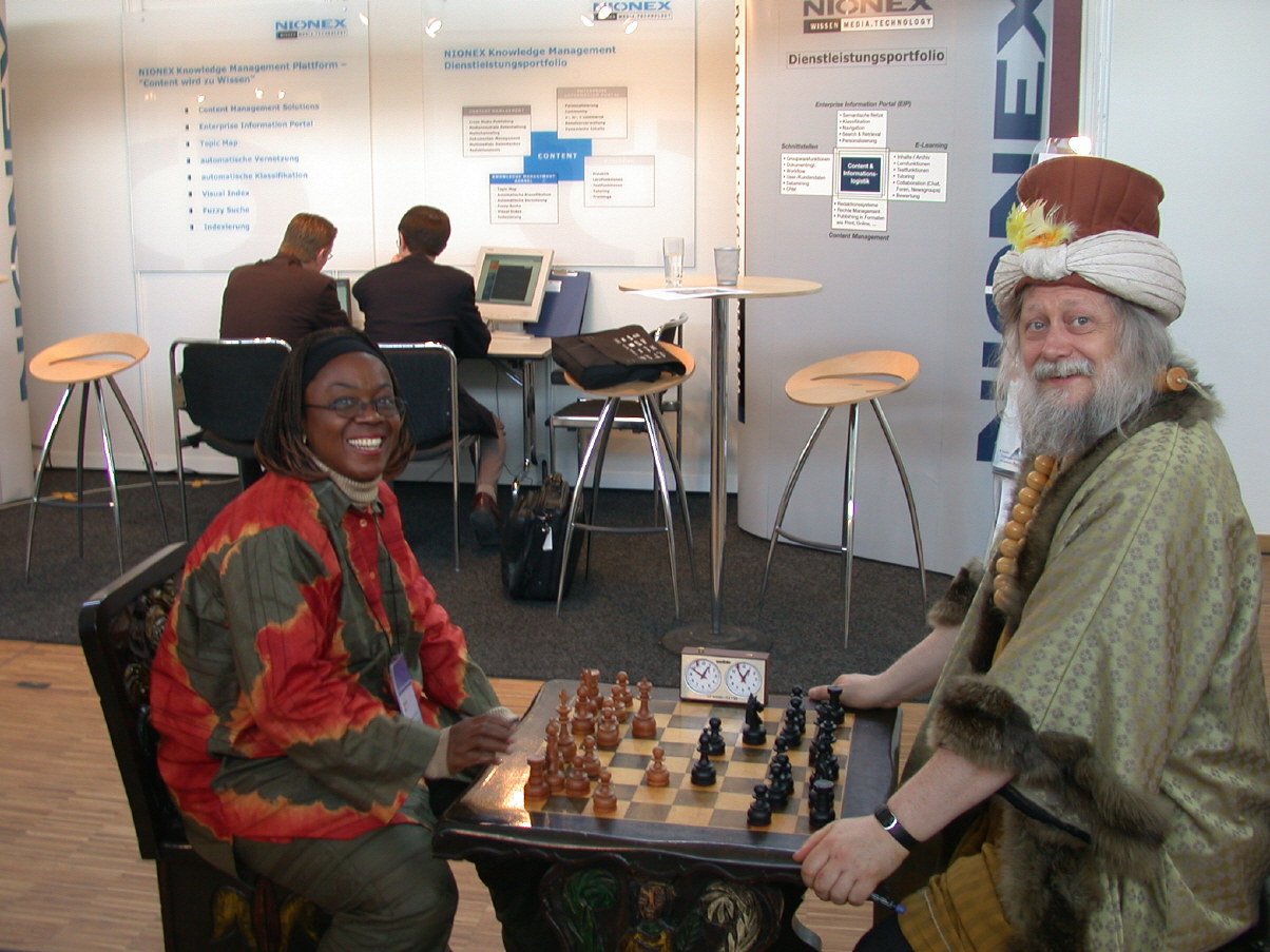 ETD2003 Conference at Humboldt University, Berlin, wo ich gegen zahllose Teilnehmer in dem Gewand des ersten türkischen Schachautomaten spielte, 12 Stunden am Tag, vier Tage lang