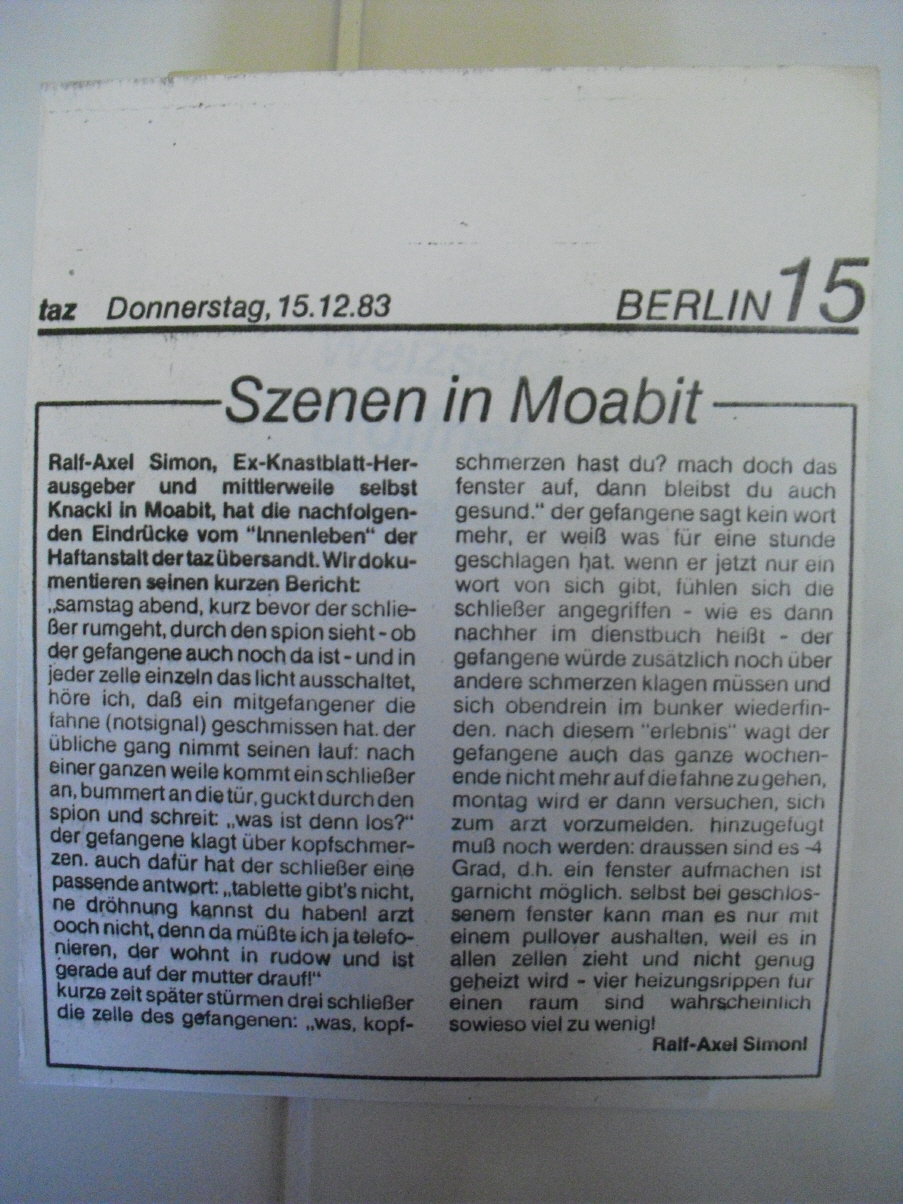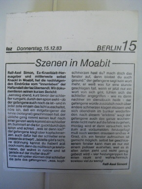 Szenen in Moabit Ralf-Axel Simon, Ex-Knastblatt-Herausgeber und mittlerweil selbst Knacki in Moabit, hat die nachfolgenden Eindrücke vom "Innenleben" der Haftanstalt der taz übersandt. Wir dokumentieren seinen kurzen Bericht. "samstag abend, kurz bevor der schließer rumgeht, durch den Spion sieht - ob der gefanene auch noch da ist - und in jeder zelle einzel das licht ausschaltet, höre ich, daß ein mitgefangener die fahne (notsignal) geschmissen hat. der übliche gang nimmt seinen lauf:nach einer ganzen weile kommt ein schließer an, bummert an die tür, guckt durch den spion und schreit:"was ist denn los?" der gefangene klagt über kopfschmerzen. ach dafür hat der schließer eine passende antwort:"tablette gibt`s nicht, ne dröhnung kannst du haben!arzt ooch nicht, denn da müßte ich ja telefonieren, der wohnt in rudow und ist gerade auf der mutter drauf!" kurze zeit später strürmen drei shließer die zelle des gefangenen:"was, kopfschmerzen hast du? mach doch das fenster auf, dann bleibst du auch gesund." der gefangene sagt kein wort mehr, er weiß was für eine stunde geschlagen hat. wenn er jetzt nur ein wort von sich gibt, fühlen sich die schließer angegriffen - wie es dann nachher im dienstbuch heißt - der gefangene würde zusätzlich noch über andere schmerzen klagen müssen und sich obendrein im bunker wiederfinden. nach diesem "erlebnis"wagt der gefangene auch das ganze wochenende nicht mehr auf die fahne zu gehen. montag wird er dann versuchen, sich zum arzt vorzumelden. hinzugefügt m uß noch werden:draussen sin es -4 grad, d.h. ein fenster aufmachen ist garnicht möglich. selbst bei gechlossenem fenster kann man es nur mit einem pullover aushalten, weil es in allen zellen zieht und nicht genug geheizt ewird - vier heiungsrippen für einen raum sind wahrscheinlich viel zu wenig Ralf-Axel Simon!