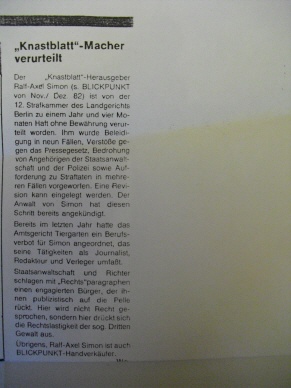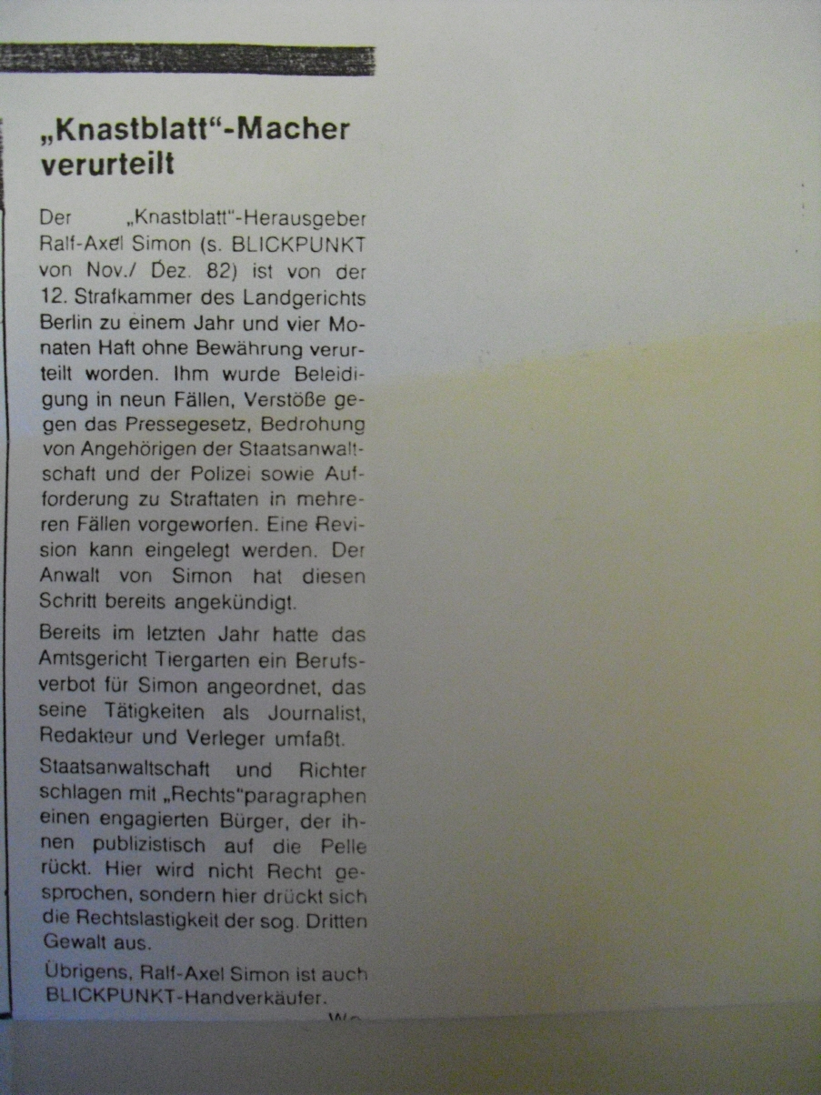 "Knastblatt"-Macher verurteilt Der "Knastblatt"-Herausgeber Ralf-Axel Simon (s.BLICKPUNKT von Nov/Dez 82) ist von der 12. Strafkammer des Landgerichtes Berlin zu einen Jahr und vier Monaten Haft ohne Bewährung verurteilt worden. Ihm wurde Beleidigung in Neun Fällen, Verstöße gegen da Pressegesetz , Bedrohung von Angehörigen der Staatsanwaltschaft ud der Polizei sowie Aufforderung von Straftaten in mehrern Fällen vorgeworfen. Eine Revision kann eingelegt werden. Der Anwalt von Simon hat diesen Schritt bereits angekündigt. Bereits im letzten Jahr hatte das Amtsgericht Tiergarten ein Berufsverbot für Simon angeordnet, das seine Tätigkeit als Journalist, Redakteur und Verleger umfaßt. Staatsanwaltschaft und Richter schlagen mit "Rechts"paragraphen einen engagierten Bürger, der Ihnen publizistisch auf die Pelle rückt. Hier wird nicht Recht gesprochen , sondern hier drückt sich die Rechtslastigkeit der sog. Dritten Gewalt aus. Übrigens, Ralf-Axel Simonist auch BLICKPUNKT-Handverkäufer.