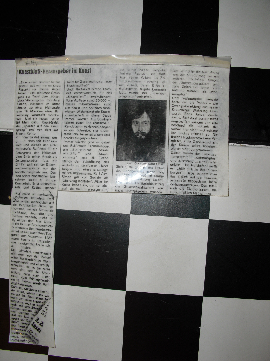 ZITTY Februar 1983 Knastblatt-Herausgeber im Knast "Es sei einmal deutlich herausgestellt, daß wir hier im Knast Respekt vor deiner Arbeit haben". Das schrieben Gefangene aus Tegel dem "Knastblatt"-Herausgeber Ralf-Axel Simon, nachdem er mitte Januar zu einer Haftstrafe von 16 Monaten ohne Bewährung verurteilt worden war. Und sie legten runde 80 Mark dazu. Knast-Geld, das "Spontan auf den Tisch sprang" und von dort auf Simons Konto. knast-Solidarität einmal umgekehrt , denn seit 1977sammelt und wirbelt der nicht vorbestrafte Ralf-Axel für die Gefangenen der Haftanstalt. Vom Erlös seiner Arbeit als Zeitungsausträger (u.a. für ZITTY) zahlt sich der siebenundzwanzigjährige nur den Sozialhilferegelsatz aus. Demn Rest seiner monatlichen Einnahmen steckt er in die Knastarbeit. Er verschickt Pakete und Radios, spendet Geld für Zusatznahrung "zum Blechnapffraß". Und:Ralf-Axel Simon zeichnet verantwortlich für das "Knastblatt"-zweiwöchentliche Auflage rund 20000 - dessen Informationen rund um Knast und politisch motivierten Widerstand die Staatsanwaltschaft immer wieder zu Strafverfahren gegen ihn anstacheln. Runde Zehn Vefahren hängen in der Schwebe , vier erstinstanzliche Urteile sind bereits ausgesprochen. Immer wieder geht es dabei um Ralf-Axels Terminologie, um "Bullenterror", "Staatsschnüffler" un d "Staatsschmutz", um die Tatbestände der Beleidigung , des Aufrufs zu strafbaren Handlungen und eines unsachgemäßen Impressums. Ralf-Axel Simon gilt vor Gericht als "Überzeugungstäter". Aber im Knast haben sie, das sei einmal deutlich herausgestellt, vor seiner Arbeit Respekt. Anfang Februar, als Ralf-Axel seiner Arbeit als Zeitungsausträger nachging, einer Arbeit, deren Erlös er Gefangenen zugute kommen läßt, wurde der Überzeugungstäter verhaftet. sicher, da gibt es das Urteil des landgerichts gegen ihn, ein Urteil, das auf 16 Monate ohne Bewährung lautet. Aber dem Haftbefehlsantrag der Staatsanwaltschaft war nicht stattgegeben worden. Der Grund für die Verhaftung von der Straße weg, war ein anderer, Ralf-Axel Simon, der "Überzeugungstäter" gilt zum Zeitpunkt seiner Verhaftung nämlich als "wohnungslos". Und wohnungslos gemacht hatte ihn die Polizei - per Zwqangsabmeldung aus seiner Kreuzberger Wohnung. Diese wurde Ende Januar durchsucht, Ralf-Axel konte nicht angetrofen werden und also beschied die polizei: der wohnt hier nicht mehr und meldete ihn höchst offiziell ab. Die übliche Rücksprache beim Vermieter, einer Genossenschaft, der Simon selbst angehört, wurde nicht vorgenommen. Damit wurde der "Überzeugungstäter" "wohnungslos" und es bestand "akute Fluchtgefahr". Im Haftbefehl heißt es:"hält sich in Berlin verborgen". dabei konnte man ihn täglich auf der Hardenbergstrasse beobachten , beim Zeitungenaustragen. Das taten auch die Zivilpolizisten, die ihn schließlich festnahmen. Noch etwas ist merkwürdig an diesem Haftbefehl. Dort wird nämlich ausdrücklich auf ein Berufsverbot bezug genommen, wonach Simon als Redakteuer, Journalist und Verleger vorläufig nicht tätig werden darf. Nur:Dieser in der Berliner Pressegeschichte einmalige Berufsverbotsbeschluß des Amtsgerichtes Tiergarten vom September 1982 wurde bereits im Dezember vom Landgericht Berlin wieder aufgehoben. Den Haftbefehl untermauert mit einer von der Polizei selbst herbeigeführten Wohnungslosigkeit und einem Berufsverbot , das es gar nicht mehr gibt, hielt der Überprüfung dann auch nicht stand. Zum Prüfungstermin am 10. Februar wurde ralf-Axel freigelassen. Doch das, worüber er schreibt, der Knast, wartet nach wie vor auf ihn. Nach seines Anwalts und seiner eigenen Einschätzung muß er insgesamt wohl mit drei Jahren hinter Gittern rechnen. "Es sei einmal deutlich herausgestellt, daß wir hier im Knast Respekt vor deiner Arbeit haben" schrieben die Gefangenen aus Tegel dem "Überzeugungstäter"...